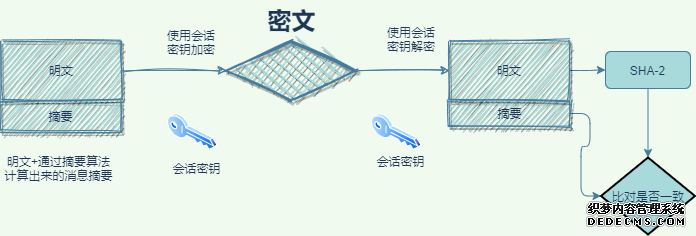 2 摘要”,关二爷收到后使用密钥将解密出来的会话密钥解密出明文消息,同时对明文消息使用解密出来的摘要算法进行摘要计算,接着比对两份“摘要”字符串是否一致,如果一致就说明消息完整可信,没有被敌军修改过。