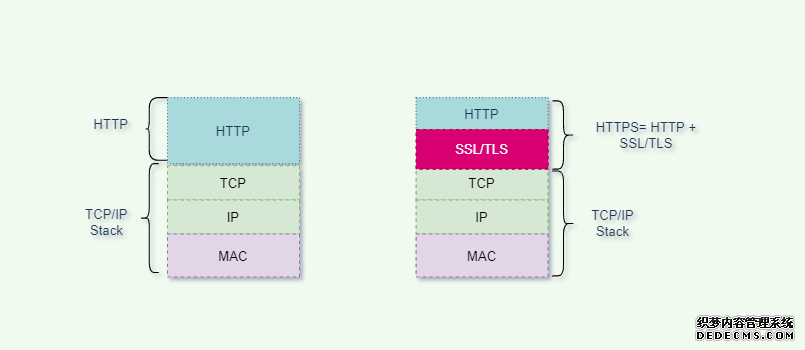 就是因为他在 TCP/IP 与 HTTP 之间加上了 SSL/TLS ,从原来的 HTTP over TCP/IP 变成了 HTTP over SSL/TLS,让 HTTP 运行在 安全的 SSL/TLS 协议上,安全开车。