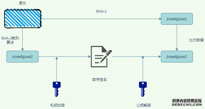 重点就是使用非对称加密的“私钥”加密原文的摘要,对方则使用非对称加密的公钥解密出摘要,再比对解密出的原文通过摘要算法计算摘要与解密出的摘要比对是否一致。这样就能像签署文件一样证明消息确实是你发送的。